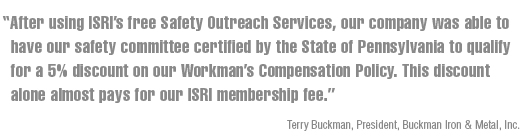 - ISRI's safety training and outreach is the best in the business, helping you improve operations and save on lost time and insurance claims.